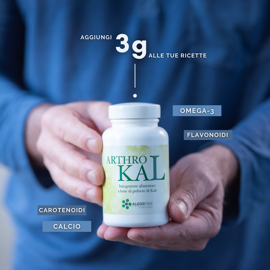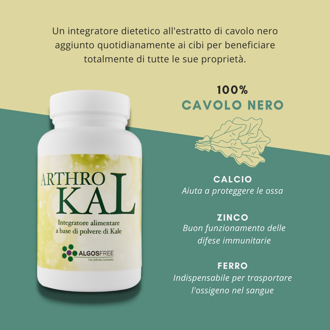 Arthro Kal è un integratore alimentare realizzato con cavolo nero 100% biologico e puro. Questo superfood è noto per le sue proprietà antiossidanti, antinfiammatorie e antimicrobiche, che lo rendono particolarmente benefico per chi soffre di artrosi e artrite.