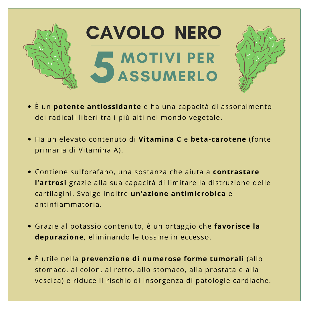 Il cavolo nero è ricco di carotenoidi, sali minerali, vitamine, Omega 3 e sulforafano, un composto che aiuta a prevenire la distruzione delle cartilagini.